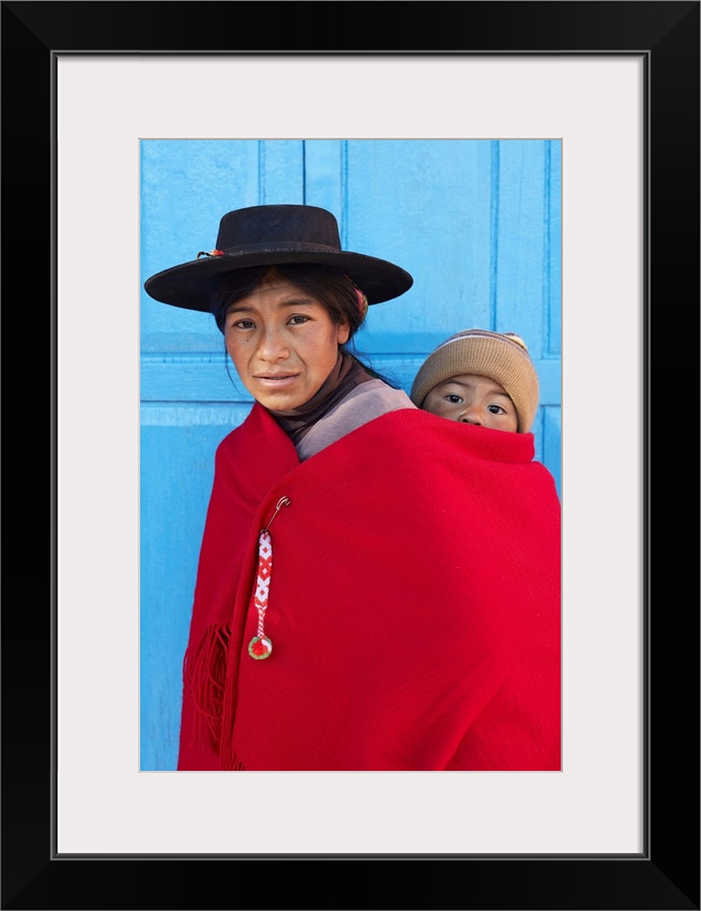 <p>Portrait of an Aymara mother in traditional clothes with her child standing in front of the antique church of Aparzo, Jujuy, Argentina.</p>