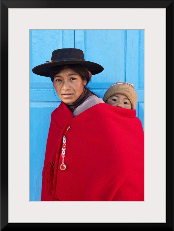 <p>Portrait of an Aymara mother in traditional clothes with her child standing in front of the antique church of Aparzo, Jujuy, Argentina.</p>