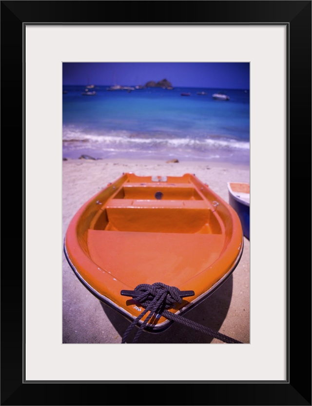 <p>An colorful orange row boat on a Caribbean beach in front of the turqoise Caribbean Sea.</p>