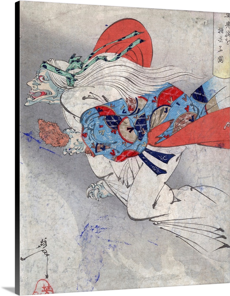 <p>Colour woodcut of Ibaraki. Woodcut shows an elderly woman or demon, possibly Ibaraki of Rashomon, flying through the air. By Yoshitoshi Taiso, Japanese artist. Dated 1886.</p>