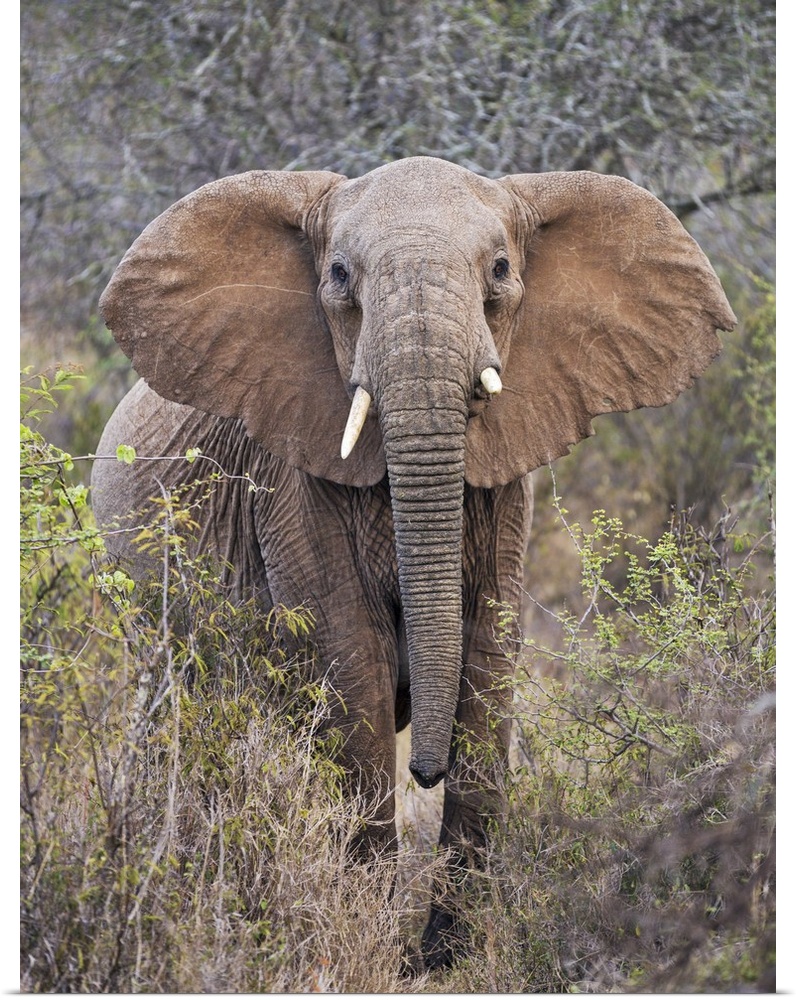 <p>Kenya, Laikipia County, Laikipia. A female elephant with raised head and outstretched ears warns visitors not to approach any closer.</p>