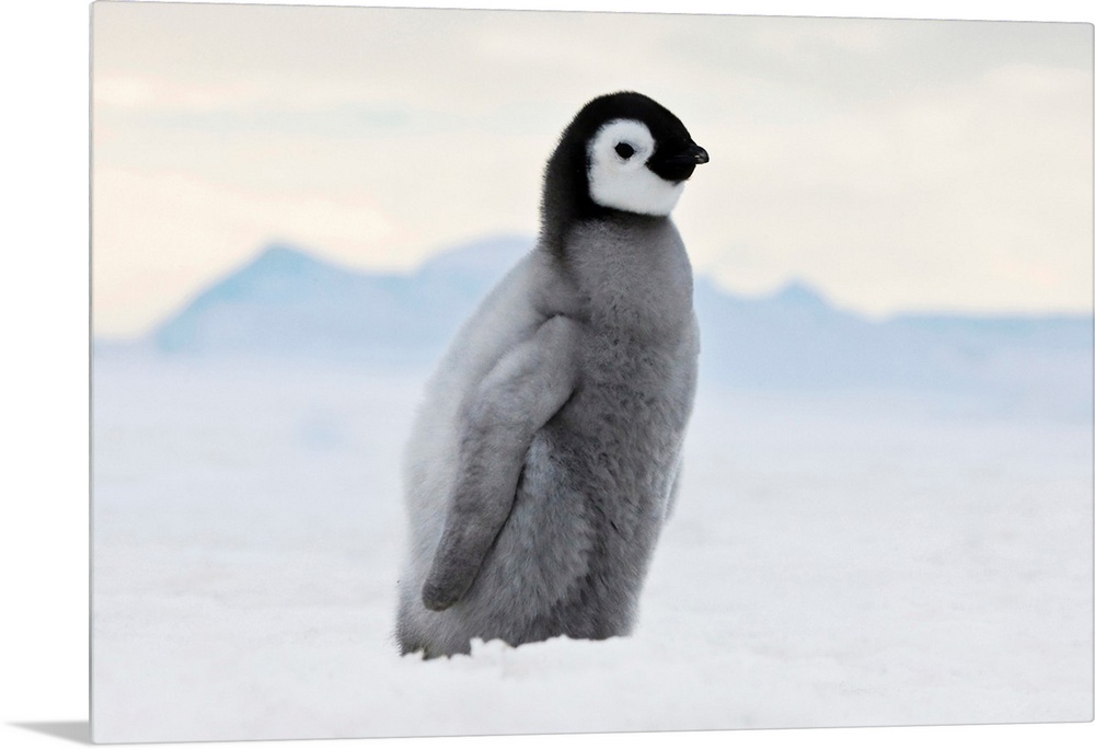 <p>An Emperor Penguin (Aptenodytes forsteri) chick walks on ice, Snow Hill Island, Antarctica.</p>