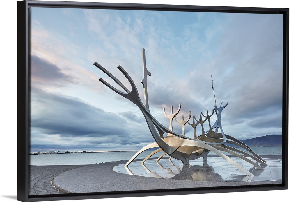<p>An evening view of the Suncraft sculpture, on the seafront at Reykjavik, capital city of Iceland, Polar Regions</p>