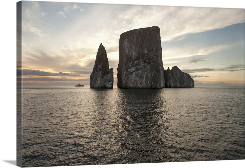 <p>An expedition vessel passes near a large rock formation at sunset. Pacific Ocean, Galapagos Islands, Ecuador</p>