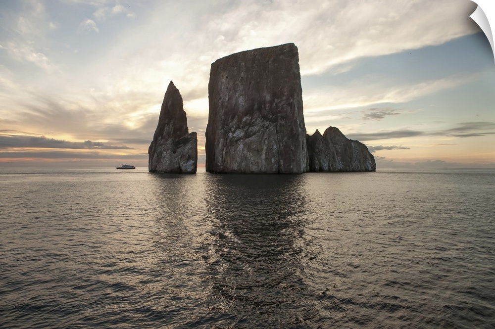 <p>An expedition vessel passes near a large rock formation at sunset. Pacific Ocean, Galapagos Islands, Ecuador</p>