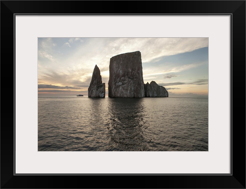 <p>An expedition vessel passes near a large rock formation at sunset. Pacific Ocean, Galapagos Islands, Ecuador</p>