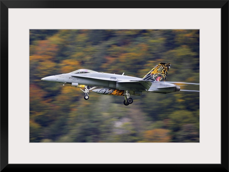 <p>An F/A-18C Hornet jet fighter of the Swiss Air Force landing, Axalp, Meiringen, Switzerland</p>