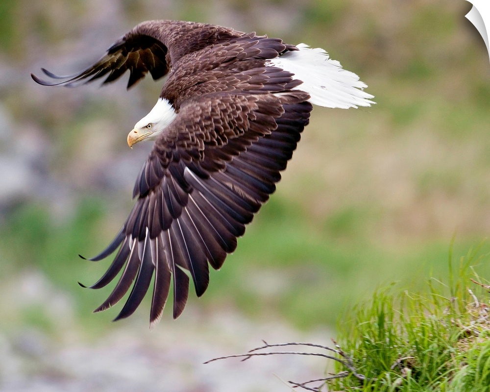<p>An female eagle flys protectively over her nest high in the rocks near Kukak Bay, Katmai National Park, Southwest Alaska, Summer</p>