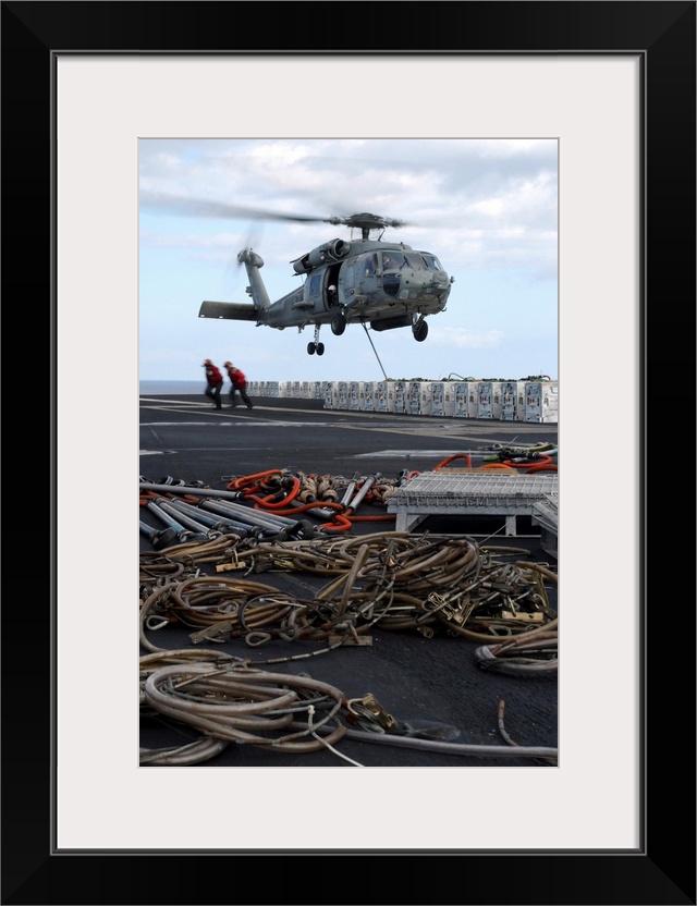 <p>An HH-60H Seahawk helicopter prepares to lift a crate of ordnance.</p>