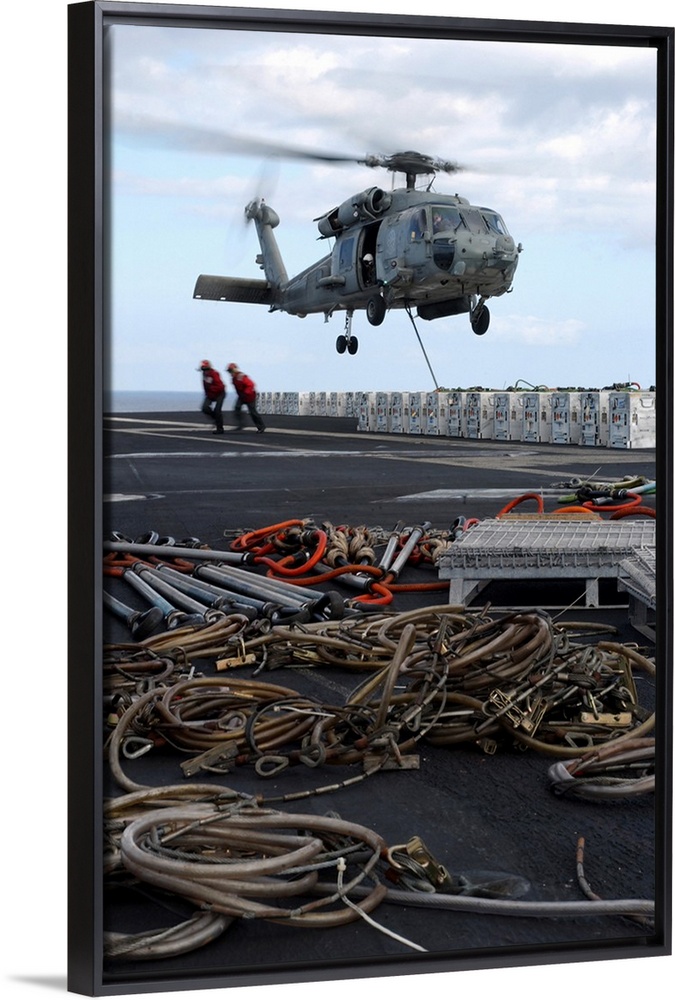 <p>An HH-60H Seahawk helicopter prepares to lift a crate of ordnance.</p>