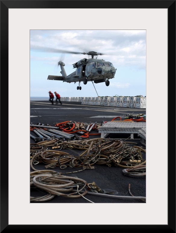 <p>An HH-60H Seahawk helicopter prepares to lift a crate of ordnance.</p>