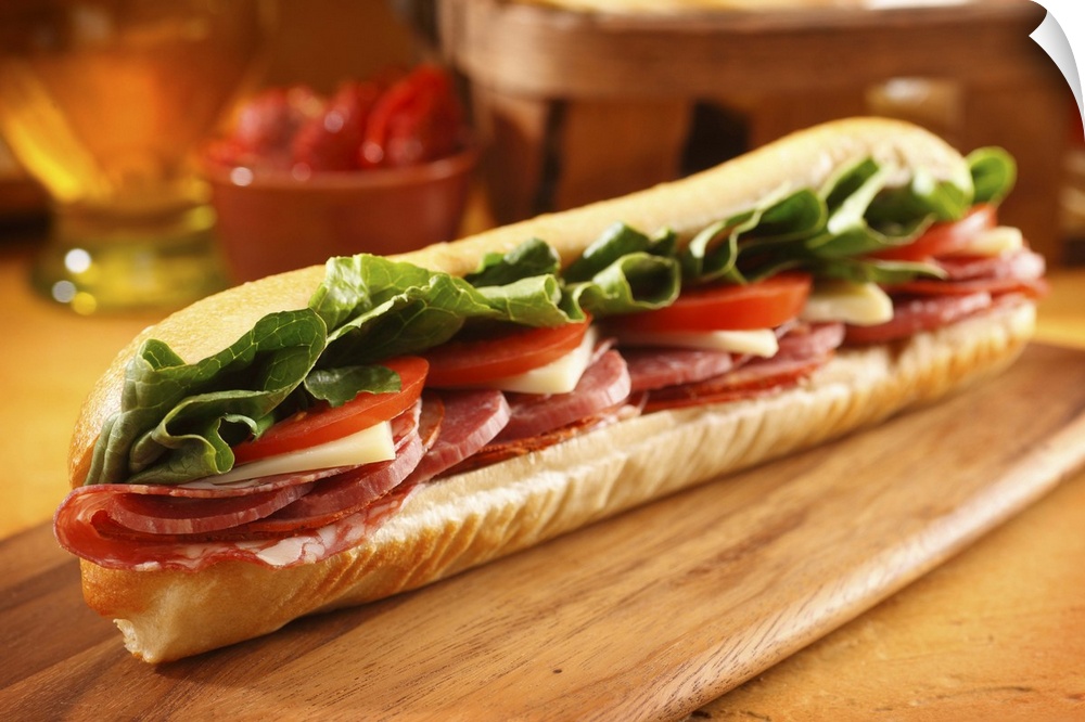 <p>An Italian sub sandwich with ham,salami,pepperoni, Swiss cheese, lettuce and tomato on a sandwich roll.</p>
