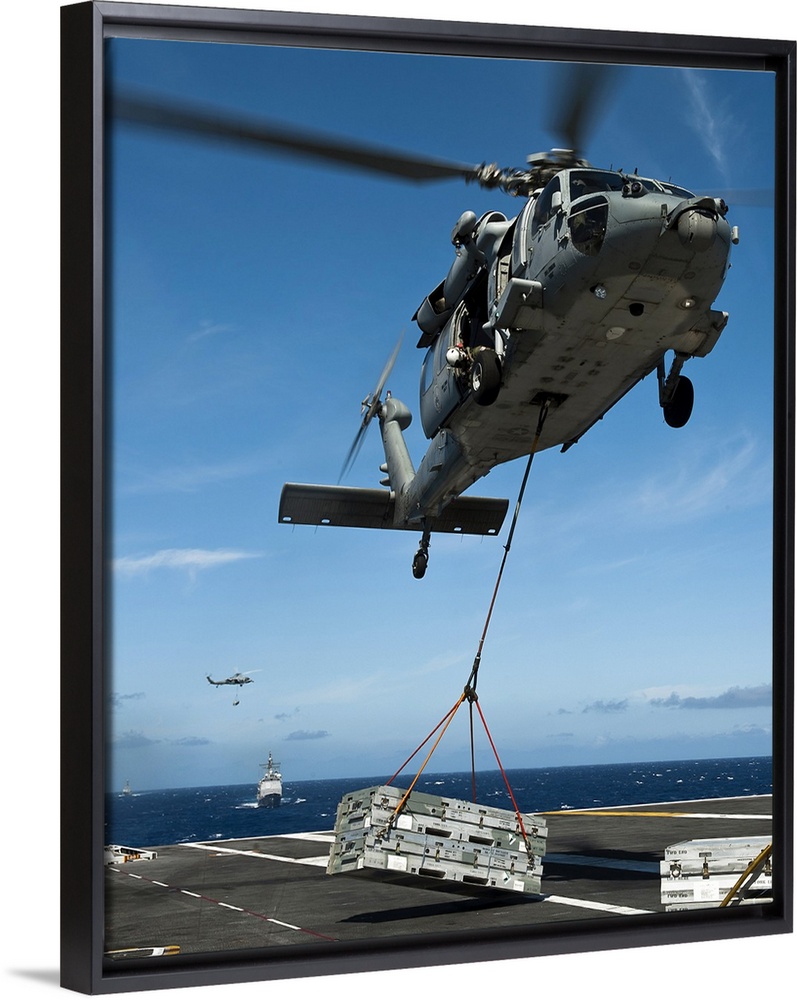 <p>Pacific Ocean, August 7, 2011 - An MH-60S Sea Hawk helicopter lowers cargo onto the deck of the Nimitz-class aircraft carrier USS John C. Stennis (CVN-74).</p>