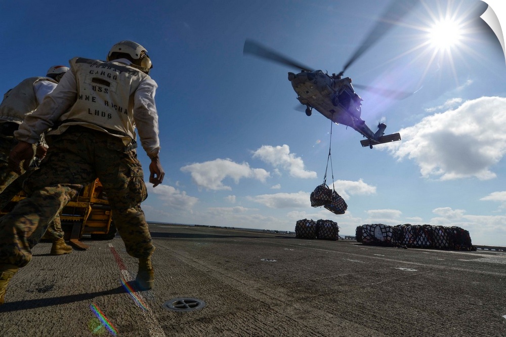 <p>South China Sea, February 8, 2013 - An MH-60S Sea Hawk helicopter lowers pallets of supplies during a vertical replenishment on the flight deck aboard the amphibious assault ship USS Bonhomme Richard.</p>