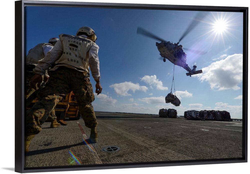 <p>South China Sea, February 8, 2013 - An MH-60S Sea Hawk helicopter lowers pallets of supplies during a vertical replenishment on the flight deck aboard the amphibious assault ship USS Bonhomme Richard.</p>