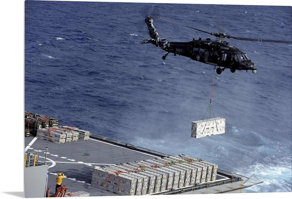 <p>Atlantic Ocean, January 15, 2013 - An MH-60S Sea Hawk helicopter picks up ammunition from the Military Sealift Command dry cargo and ammunition ship USNS William McLean.</p>