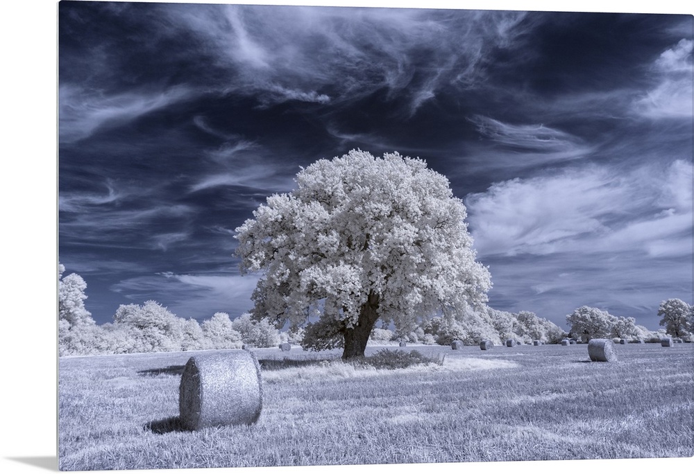 <p>An oak tree surrounded by hay bales in a rural field in Infrared.</p>