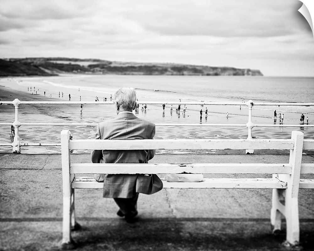 <p>An old man sits gazing out to sea, on a white bench at a seaside resort. Families can be seen on the beach beyond with cliffs in the distance</p>
