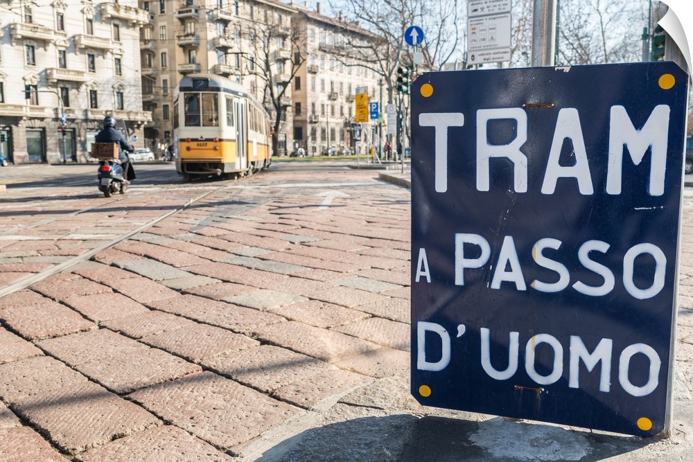 <p>An old sign in Italian that says Trams go to Duomo, with a traditional Milanese tram in the background, Milan, Lombardy, Italy</p>