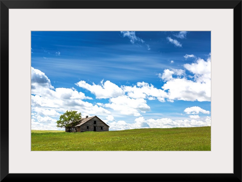 <p>An old wooden building with one tree in a rolling grassy field with clouds and blue sky, West of High River, Alberta, Canada.</p>