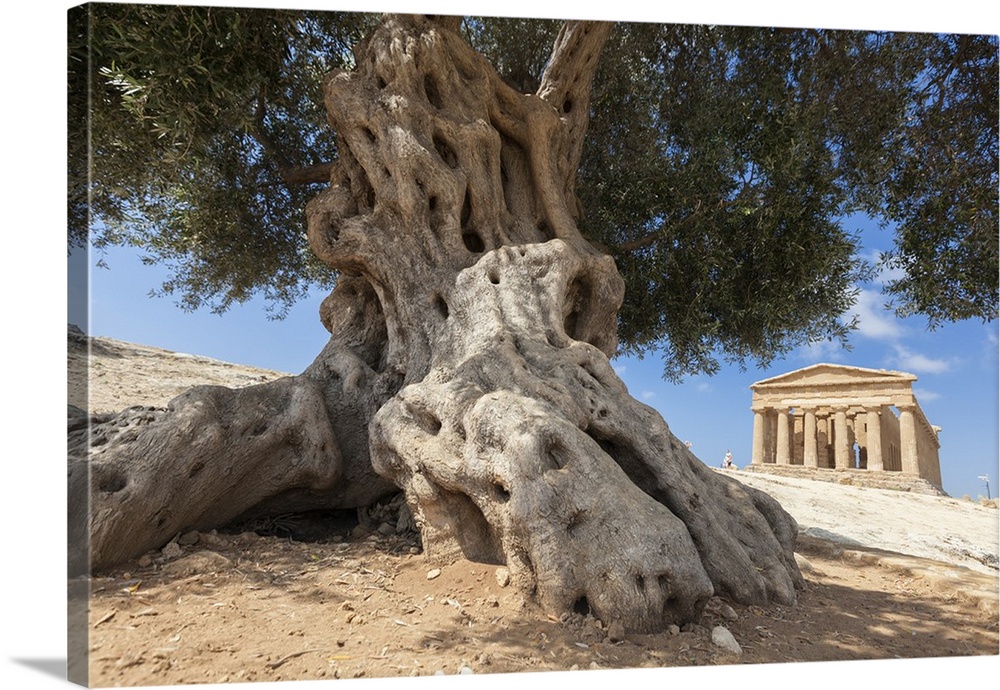 <p>An olive tree frames the ancient Temple of Concordia in the archeological site of Valle dei Templi, Agrigento, Sicily, Italy</p>