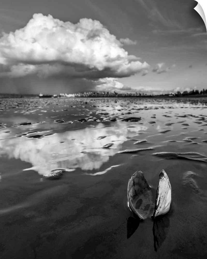 <p>An open clam shell sits on the shore with cloud reflected on the wet sand. Vancouver, British Columbia, Canada.</p>