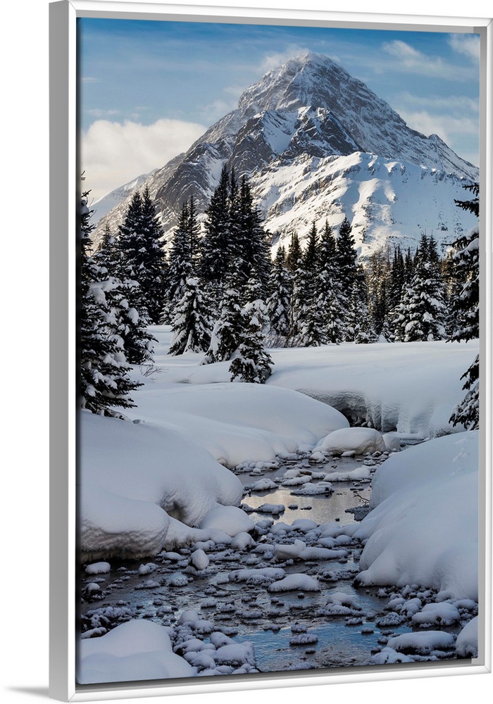 <p>An open creek with snow covered curvy banks, filled with snow covered rocks and snow covered trees with snow covered mountain, blue sky and clouds in the background; Kananaskis Country, Alberta, Canada</p>