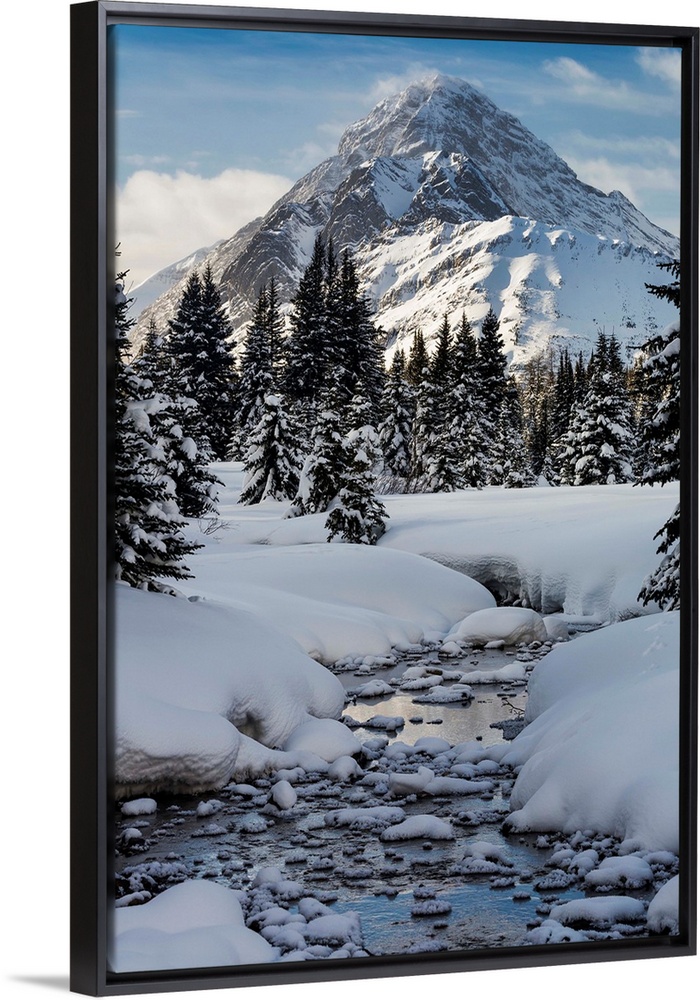 <p>An open creek with snow covered curvy banks, filled with snow covered rocks and snow covered trees with snow covered mountain, blue sky and clouds in the background; Kananaskis Country, Alberta, Canada</p>