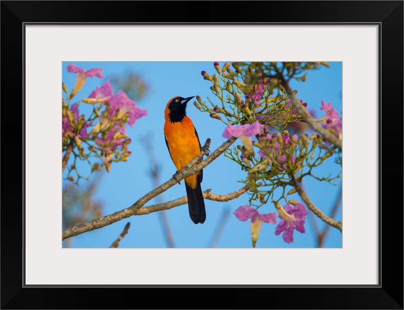 <p>South America. Brazil. An orange-backed troupial (Icterus croconotus) harvesting the blossoms of a pink trumpet tree (Tabebuia impetiginosa) in the Pantanal, the world's largest tropical wetland area, and a UNESCO World Heritage Site.</p>