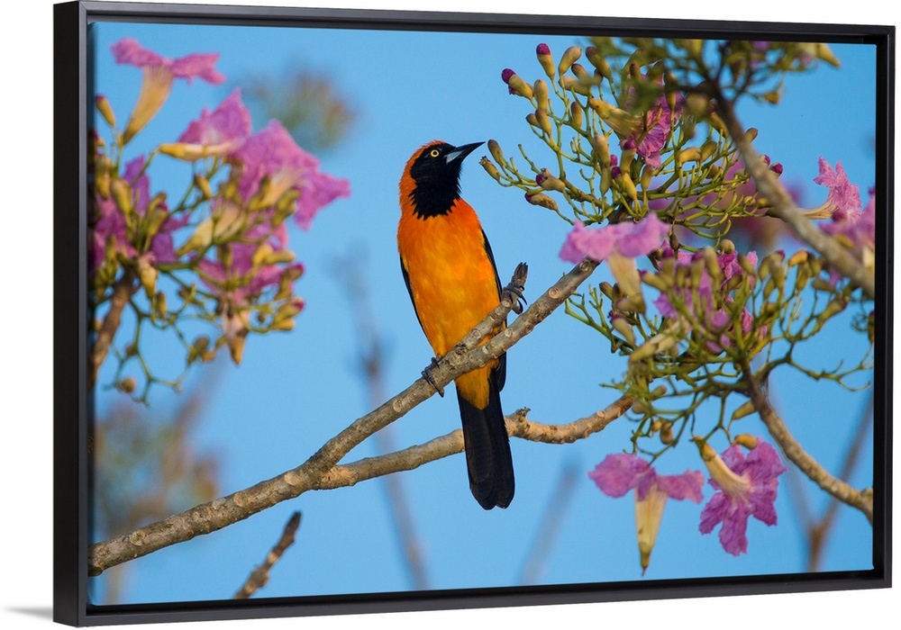 <p>South America. Brazil. An orange-backed troupial (Icterus croconotus) harvesting the blossoms of a pink trumpet tree (Tabebuia impetiginosa) in the Pantanal, the world's largest tropical wetland area, and a UNESCO World Heritage Site.</p>
