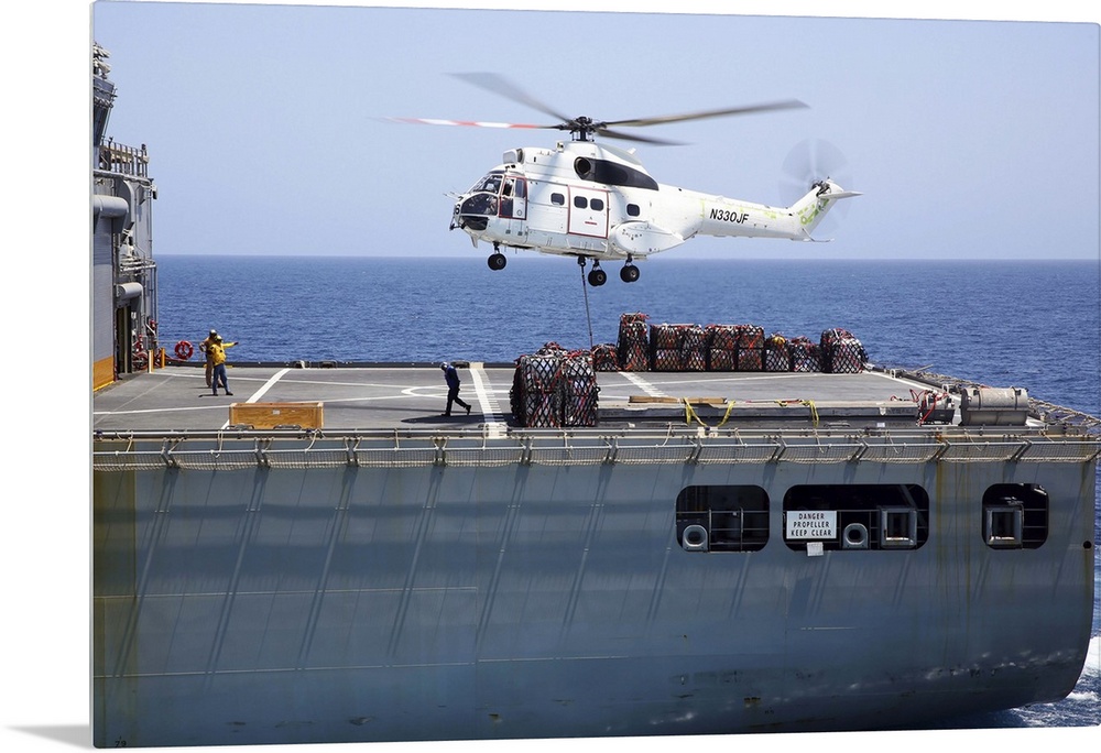 <p>Gulf of Oman, September 5, 2013 - An SA-330J Puma helicopter approaches the dry cargo and ammunition ship USNS Cesar Chavez (T-AKE 14) during a replenishment-at-sea with the amphibious assault ship USS Kearsarge.</p>