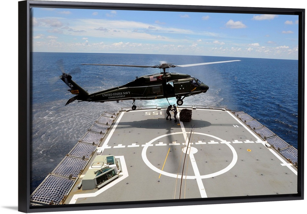 <p>An SH-60F Sea Hawk helicopter lowers pallets onto HMAS Ballarat.</p>