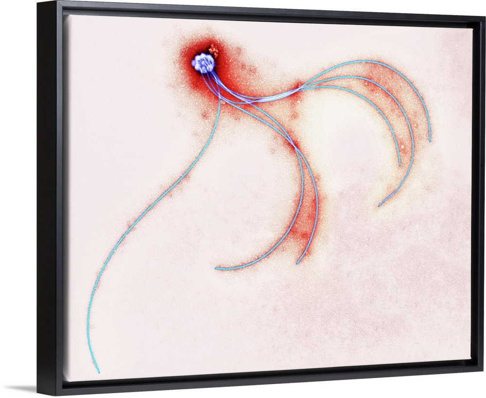 <p>Flagella of a spiral bacterium. Coloured transmission electron micrograph (TEM) of part of a bacterium with flagella attached (light blue). This bacterium is Anaerobiospirillum thomasii, a species of anaerobic spiral bacteria found in the gastrointestinal tract of humans and some animals. The bacteria normally have bipolar tufts of flagella, which propel the unicellular organism by beating with a whip-like motion. Magnification: x24,000 when printed 10 centimetres wide.</p>