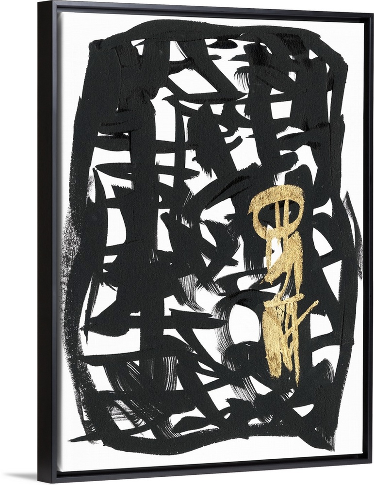 <p>Broad brush strokes in black and gold create letter-like abstract characters surrounded by a border against a white background.</p>