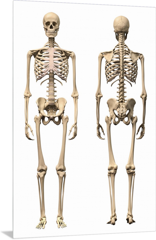 <p>Anatomy of male human skeleton, front view and back view.</p>
