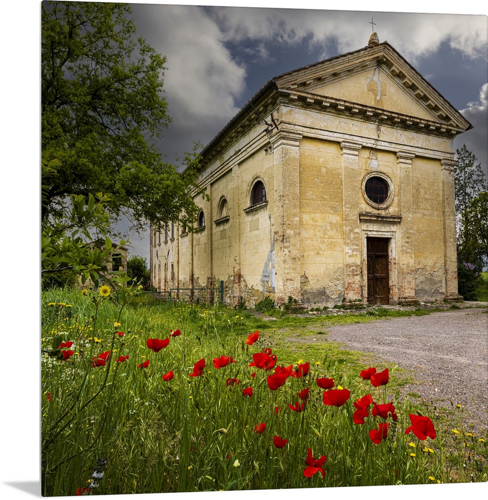 <p>Ancient church ruin surrounded by bright reed poppies. Montalcino. Tuscany, Italy.</p>