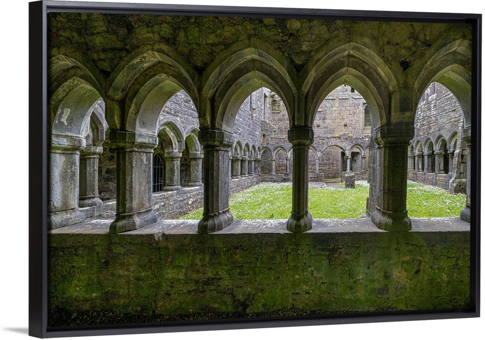 <p>Ancient cloisters surround this patch of grass at Moyne Abbey, County Mayo, Ireland.</p>