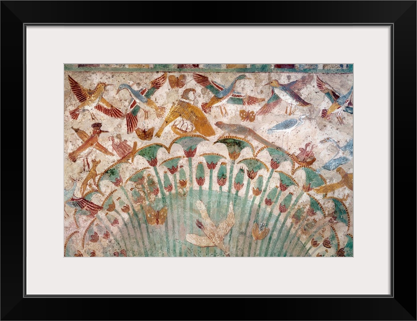 <p>Egyptian antiquity : animals in a papyrus thicket, showing a genet and a mongoose hunting among bird-filled marsh. Limestone fragment from the tomb of Neferhotep, About 1400 BC, 18th Dynasty, 43x74 cm Louvre Museum, Paris</p>