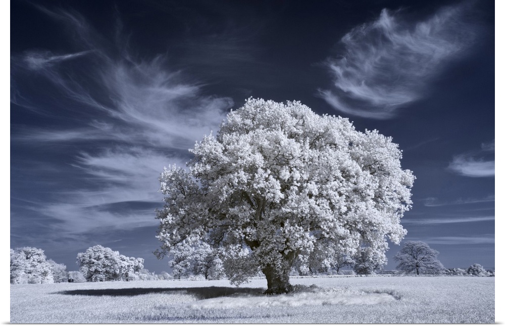 <p>Ancient oak tree in infrared with white foliage against a deep blue sky.</p>