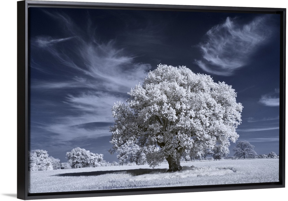 <p>Ancient oak tree in infrared with white foliage against a deep blue sky.</p>