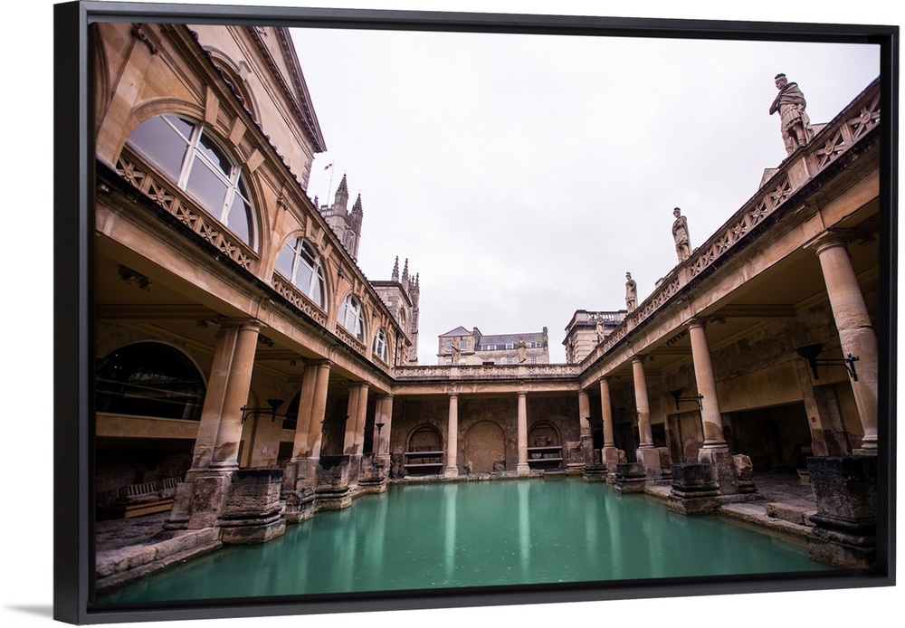 <p>Photograph of the Great Bath in England with gray, cloudy skies above, Bath, England, UK</p>