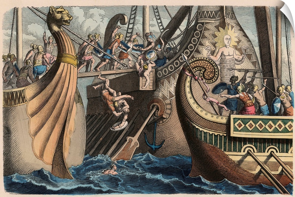 <p>Ancient Rome: Sea battle with gangplanks - Coloured engraving by Heinrich Leutemann (1824-1905) - Bilder aus dem Altertume (Pictures from Antiquity) 1866</p>