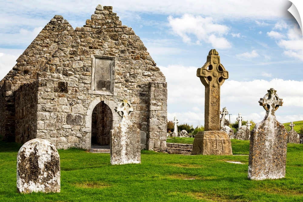 <p>Ancient stone roofless church with celtic crosses in a grassy field, County Offaly, Ireland.</p>