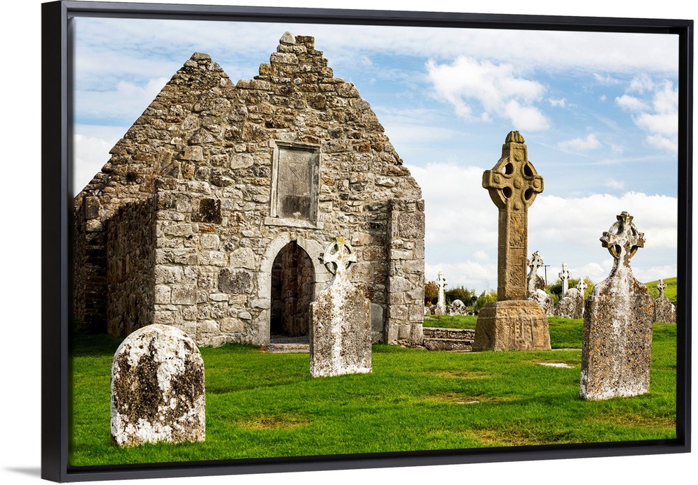 <p>Ancient stone roofless church with celtic crosses in a grassy field, County Offaly, Ireland.</p>