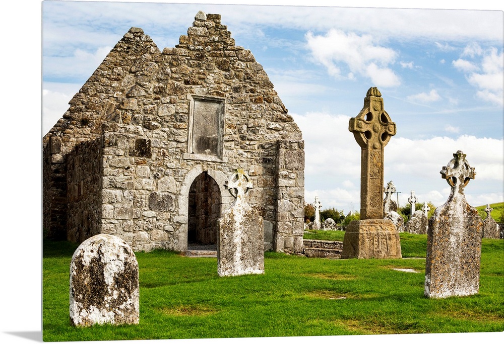 <p>Ancient stone roofless church with celtic crosses in a grassy field, County Offaly, Ireland.</p>
