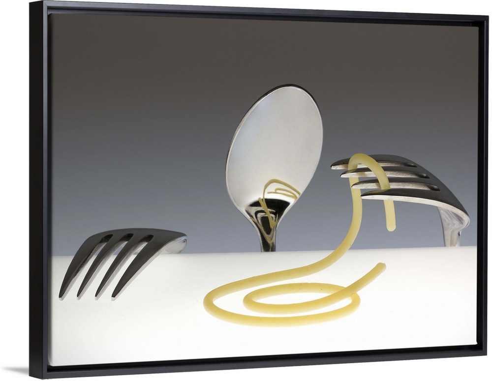 <p>Conceptual image of a spoon and two forks resembling a person, playing with spaghetti.</p>