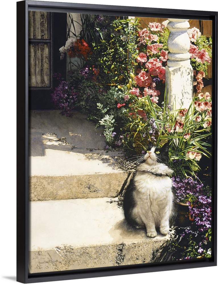 <p>A vertical image of a black and white cat sitting on the steps of a porch covered in flowers.</p>