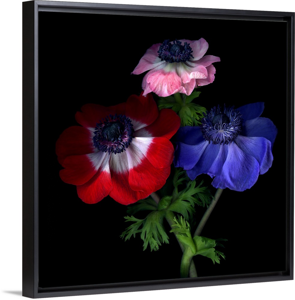<p>Red, pink and blue anemone flowers.</p>
