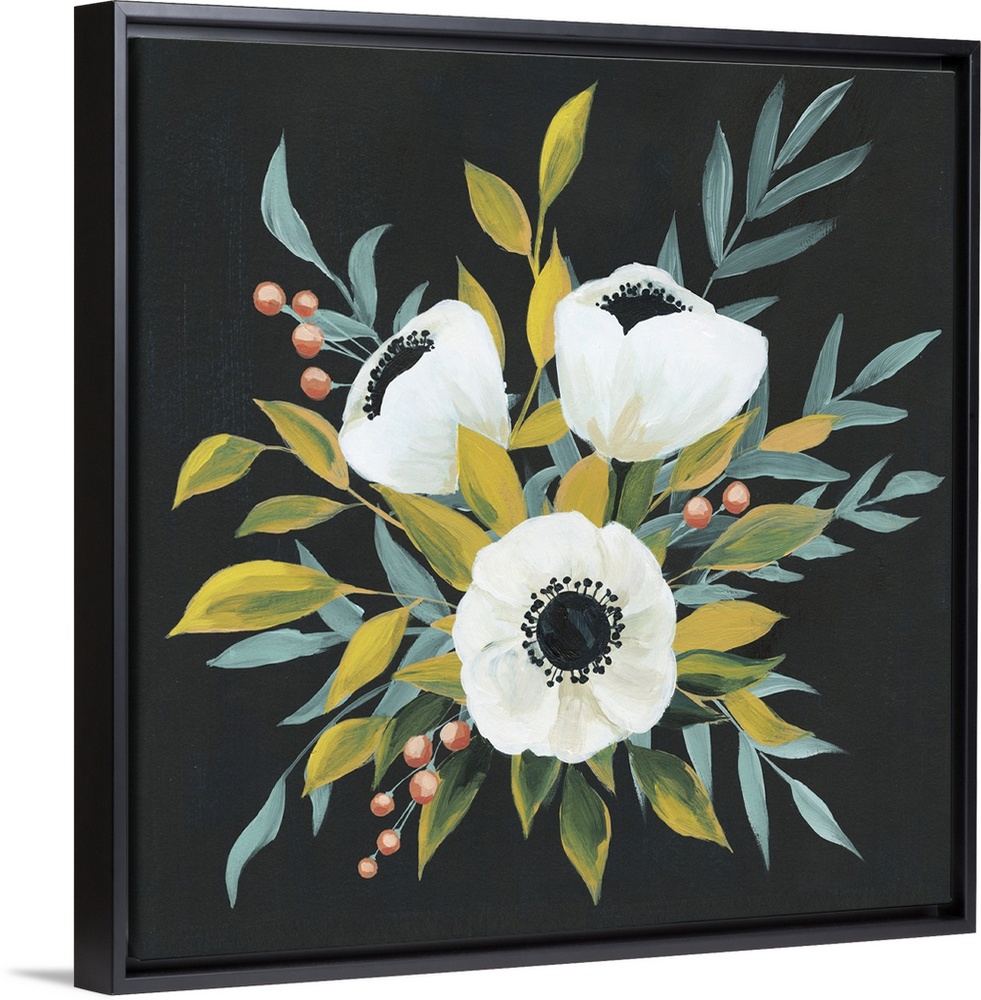 <p>A decorative painting of a group of white flowers with green and blue leaves and red berries on a black background.</p>