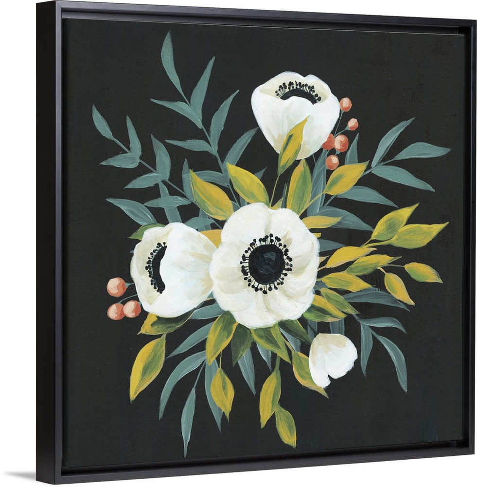 <p>A decorative painting of a group of white flowers with green and blue leaves and red berries on a black background.</p>